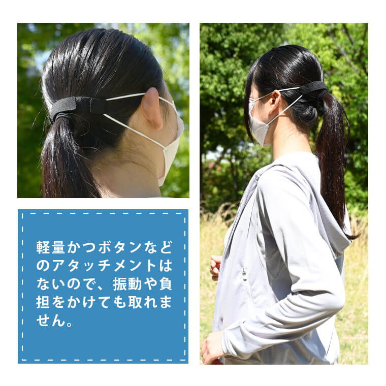 トップ > マスクベルト > 【お得10セット】耳が痛くならないマスクベルト!シリコン性ベルトでは不可能だった後部での脱着機能付き、耳に優しい洗えるマスク補助具【日本製 マスクゴム紐 補助バンド フックベルト マスク留め具 耳に掛けない マスクフック 耳ガード イヤーガード 黒】Lot-NO01